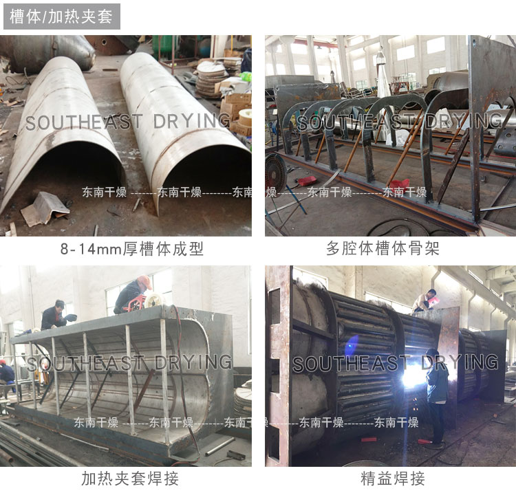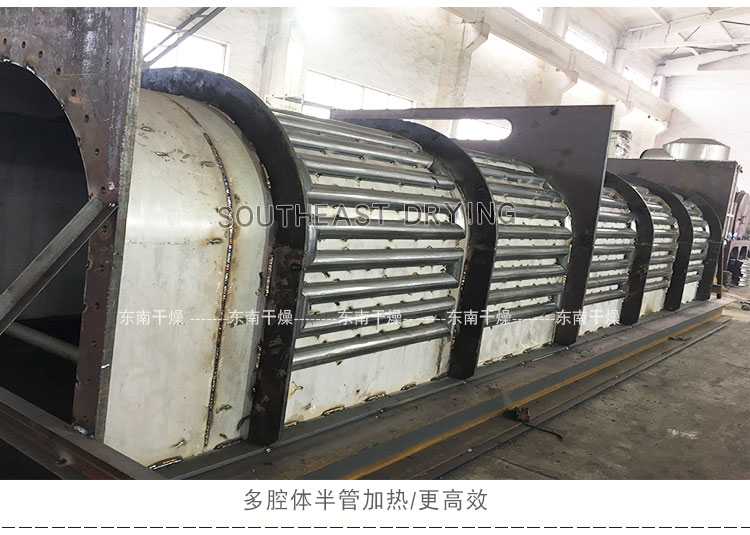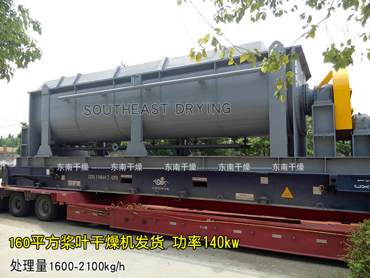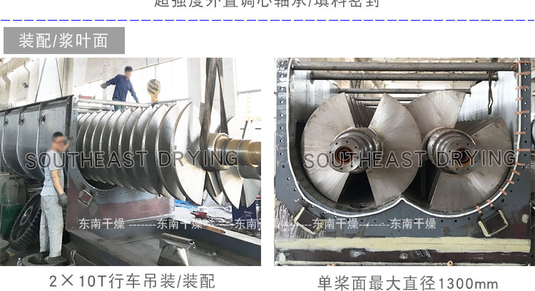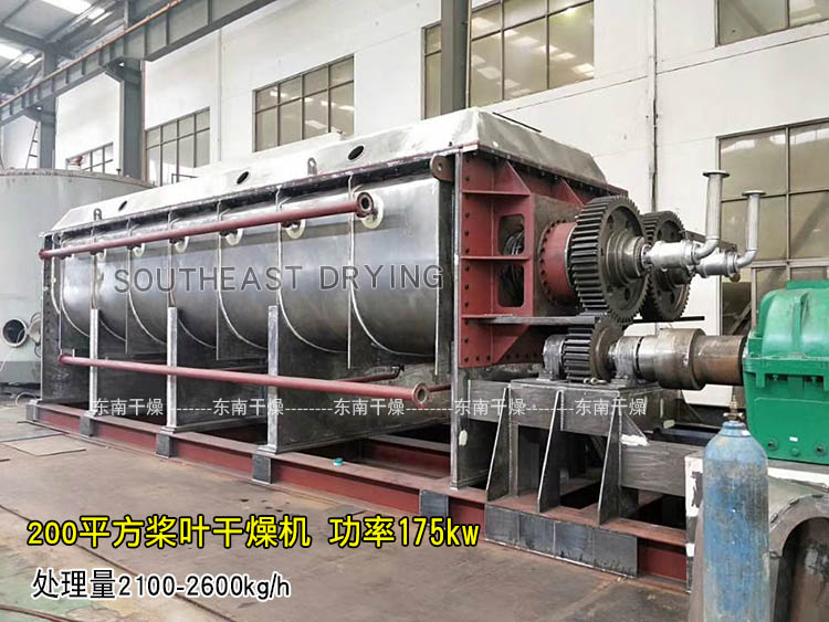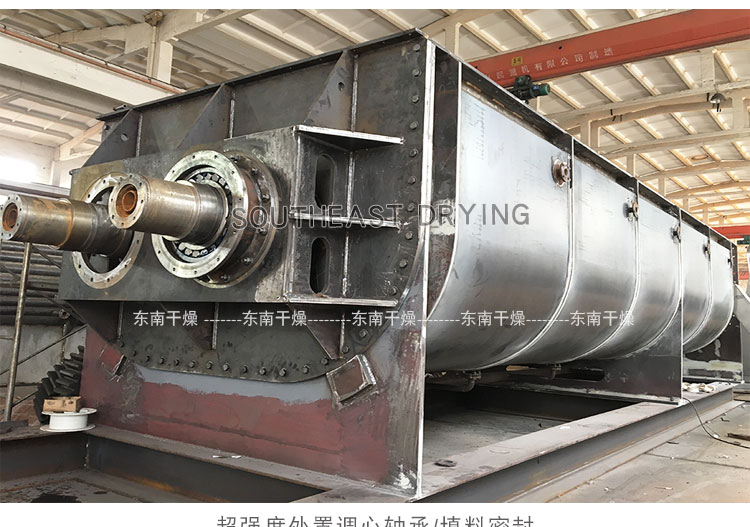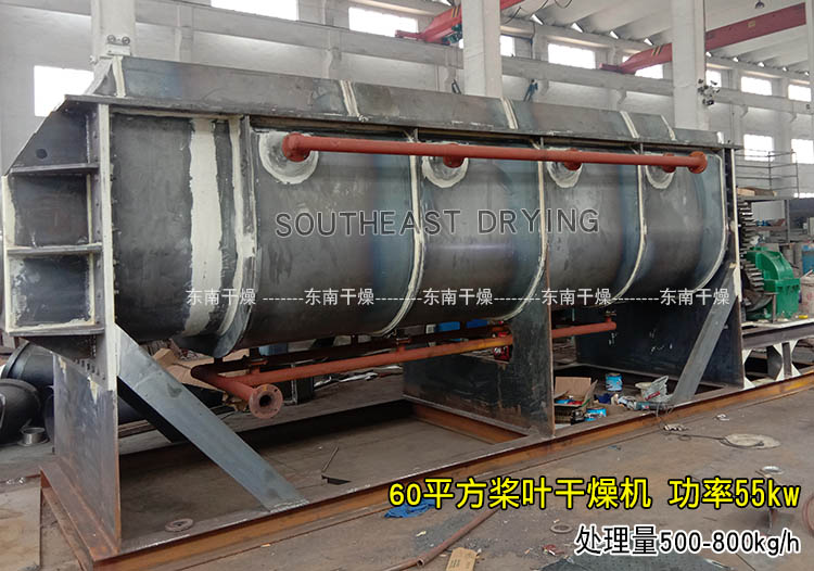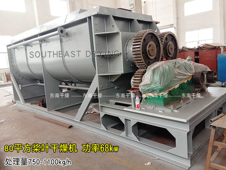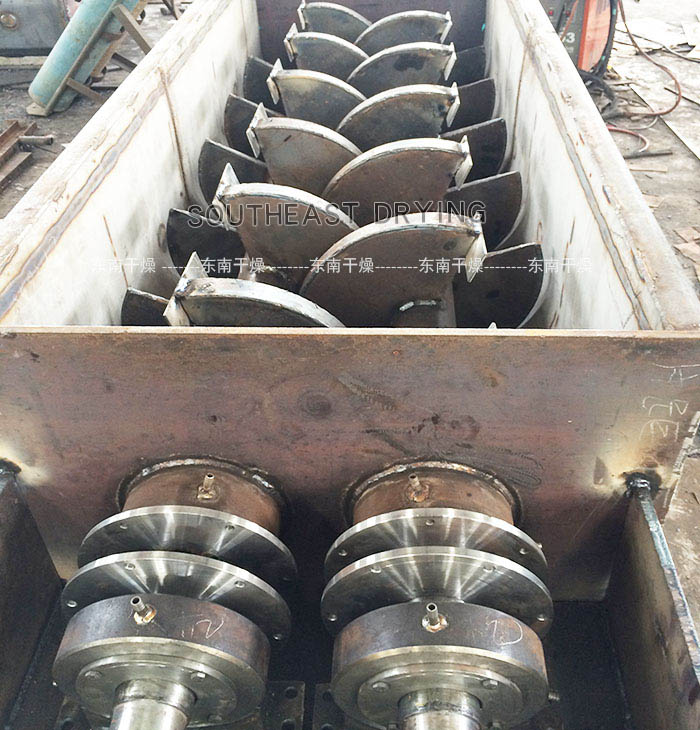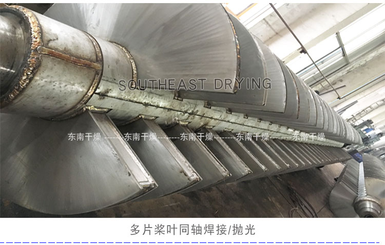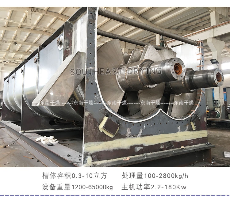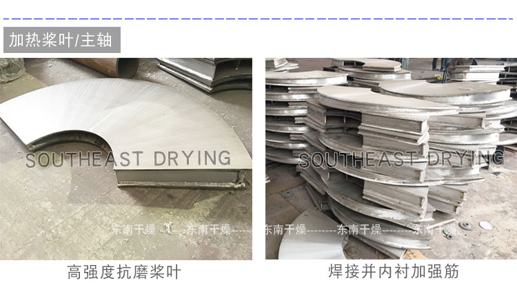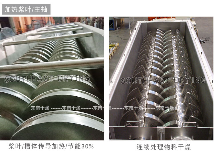 空心軸上密集排列著楔型中空漿葉,熱介質經空心軸流經漿葉。單位有效容積內傳熱面積很大,熱介質溫度從常溫到320℃,可以是水蒸汽,也可以是液體型:如熱水、導熱油等。間接傳導加熱,沒有攜帶空氣帶走熱量,熱量均用來加熱物料。熱量損失僅為通過器體保溫層向環境的散熱。楔型漿葉傳熱面具有自清潔功能。物料顆粒與楔型面的相對運動產生洗刷作用,能夠洗刷掉楔型面上附著物料,使運轉中一直保持著清潔的傳熱面。漿葉干燥機的殼體為Ω型,殼體內一般安排二到四根空心攪拌軸。殼體有密封端蓋與上蓋,防止物料粉塵外泄而充分發揮作用。傳熱介質通過旋轉接頭,流經殼體夾套及空心攪拌軸,空心攪拌軸依據熱介質的類型而具有不同的內部結構,以保證理想的傳熱效果。