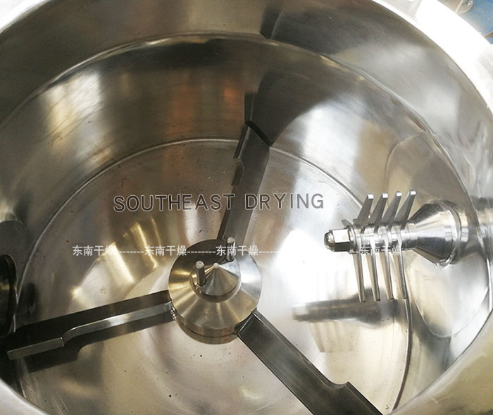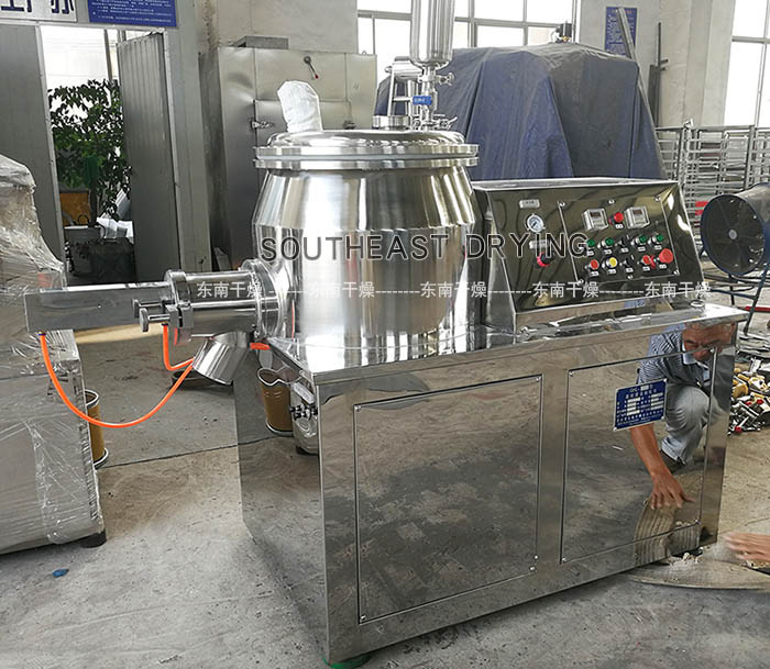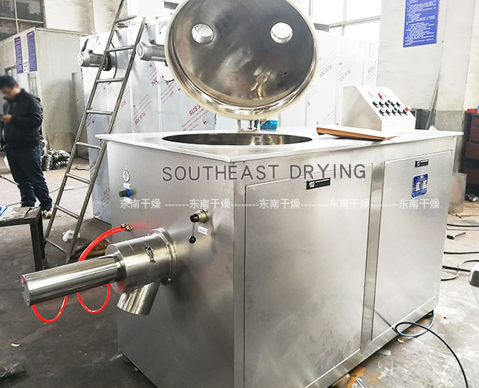 粉體物料與粘合劑在圓筒形容器中由底部混合漿充分混合成濕潤軟材,然后由側置的高速粉碎槳切割成均勻的濕顆粒。