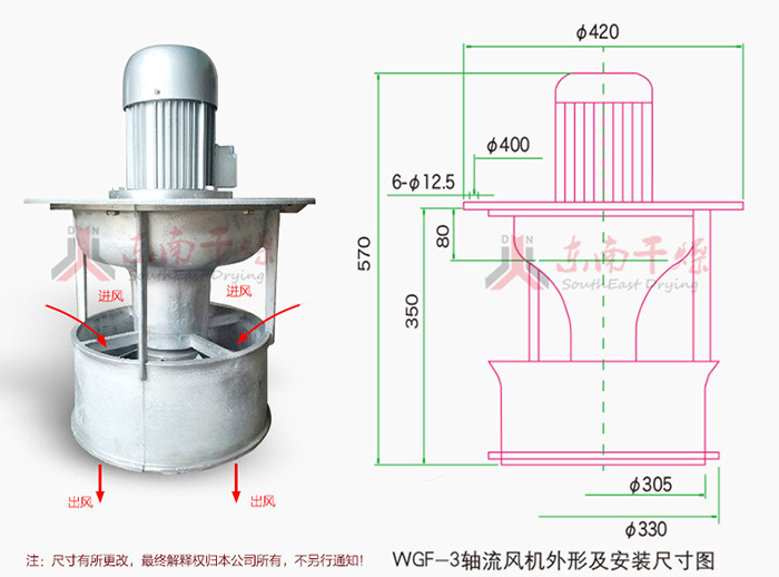 WGF-3型軸流風機是東南廠為烘干設備配套而設計的機型,是烘干設備配套風機的換代產品,其效率比離心風機提高10%。