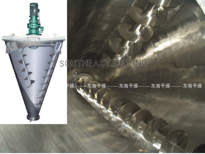 該機自轉均有一套電機及擺線針輪減速機來完成,采用兩螺桿非對稱攪拌,使物料攪拌范圍大,混合速度快,對比重懸殊,混配比較大的物料混合更為適合。本機物料接觸部分均為不銹鋼制造。